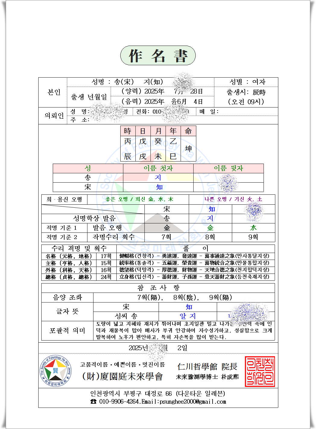 미래예측학박사, 사주명리학교수가 작명을,