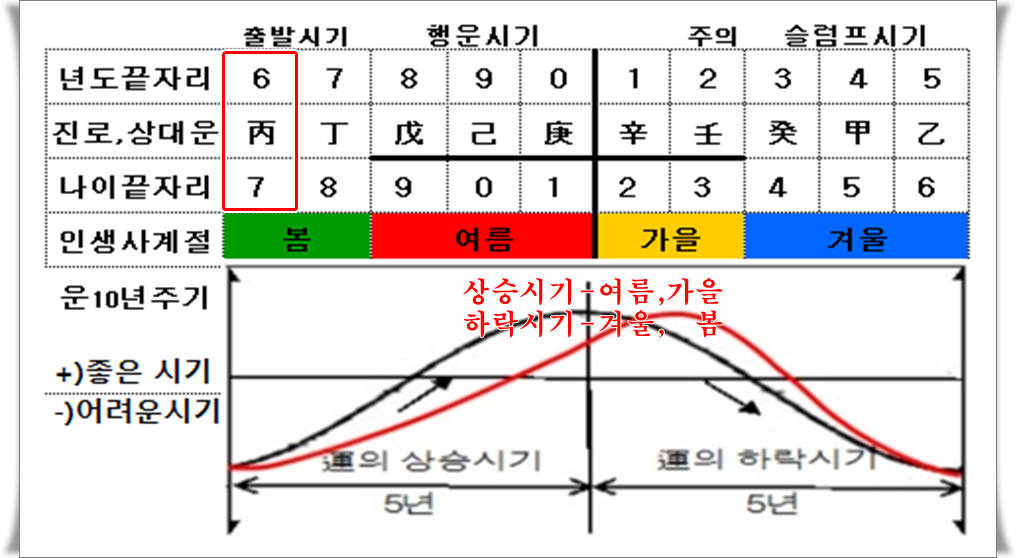 매년의 운세인 세운의 흐름을 자연과 같이 사계절로 구분한 '인생 사계절' 표입니다.